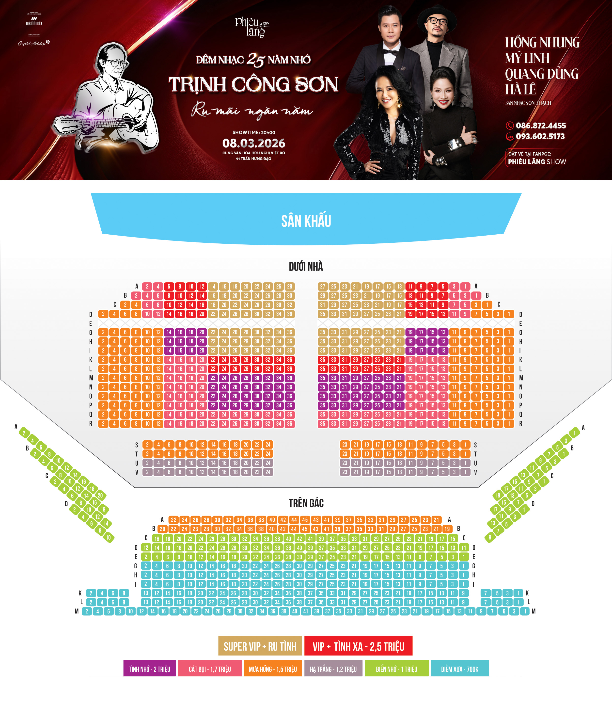 Các hạng vé: Diễm Xưa ( 700.000) – Biển Nhớ ( 1.000.000) – Hạ Trắng ( 1.200.000) – Mưa Hồng ( 1.500.000) – Cát Bụi ( 1.700.000) – Tình Nhớ ( 2.000.000) – Tình Xa ( VIP -2.500.000) – Ru Tình ( Super VIP – 3.000.000)